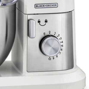 The Black & Decker MKM100-B5 Stand Mixer is designed to deliver powerful and reliable performance in the kitchen. Equipped with a robust 1000-watt motor and a spacious 6-liter mixing bowl, it easily handles large quantities and heavy doughs.